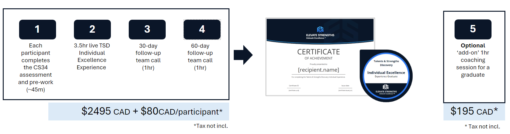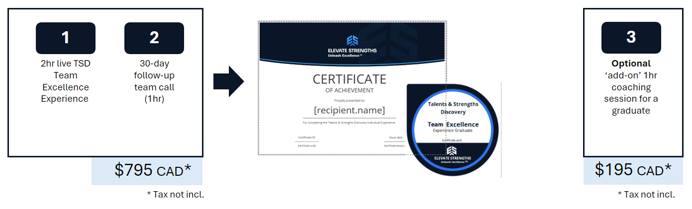 Take your team on a journey that will identify their unique talents and strengths and help them find new paths to unleashing individual excellence. Each team member will be provided with a CliftonStrengths 34 assessment and participate in a highly interactive learning experience. The experience will help them relate their talents to their current role and create powerful strengths statements based on their ‘best moments’ at work. Participants completing the assessment and learning experience will be awarded a digital certificate and badge of achievement. These credentials can be added to their LinkedIn profile and shared on other social media platforms.