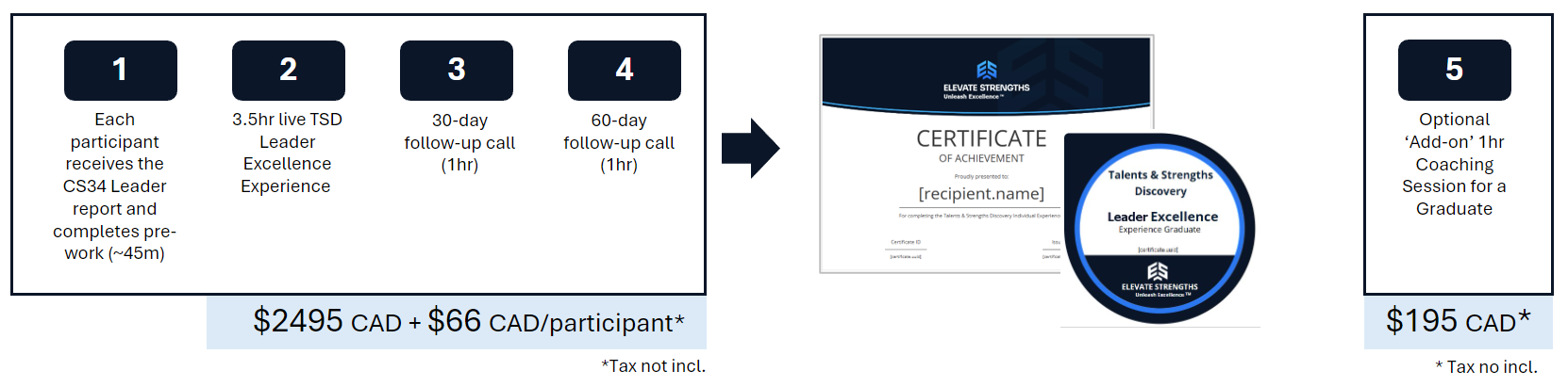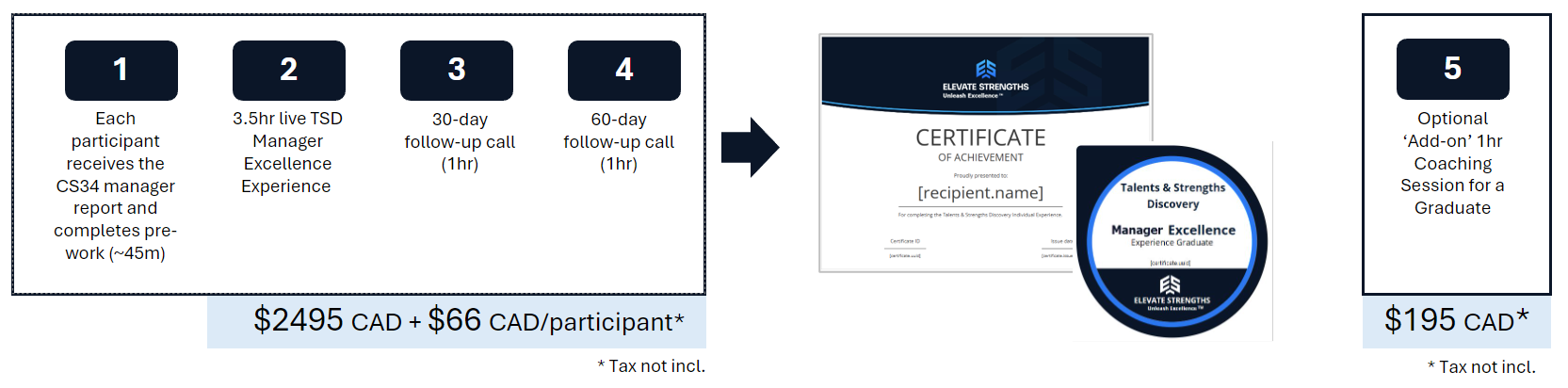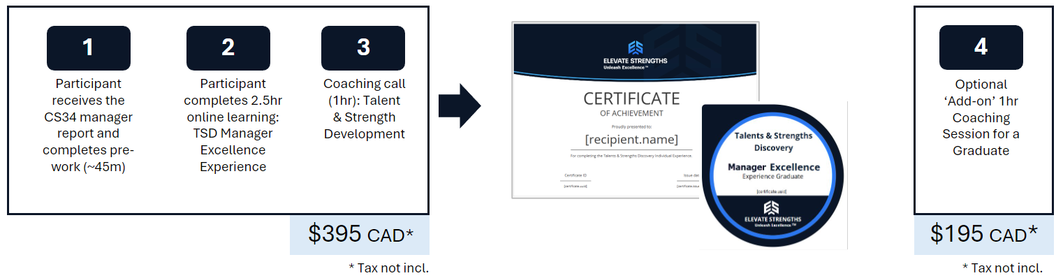 Take the journey towards improved engagement, coaching skills and collaboration! You will be provided with a CliftonStrengths 34 Manager report and complete an online learning program that will help you apply a strengths-based approach to managing your people. Once you have completed the online learning experience and follow-up coaching call requirement you will be awarded a digital certificate and badge of achievement that can be added to your LinkedIn profile and shared on other social media platforms.