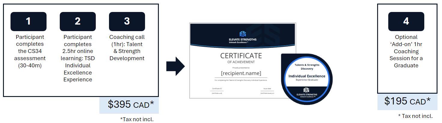 Once you have registered for the program, you will be provided with a code to complete the CliftonStrengths 34 assessment. You will then complete a series of online learning modules and work 1-1 with a Gallup Certified Strengths Coach to further explore your talents, strengths and development opportunities. Once you have completed the journey you will be awarded a digital certificate and badge of achievement that can be added to your LinkedIn profile or shared out to other social media platforms.
