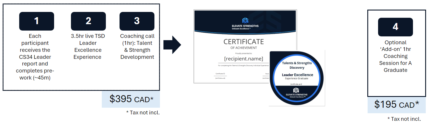 Take the journey to help connect your unique talents to the requirements of effective business and organizational leadership! You will be provided with a CliftonStrengths 34 Leader report and complete an online learning experience that will help you connect your unique talents to the requirements of effective leadership. Once you have completed the learning experience and follow-up call requirements will be awarded a digital certificate and badge of achievement that can be added to your LinkedIn profile and shared on other social media platforms.